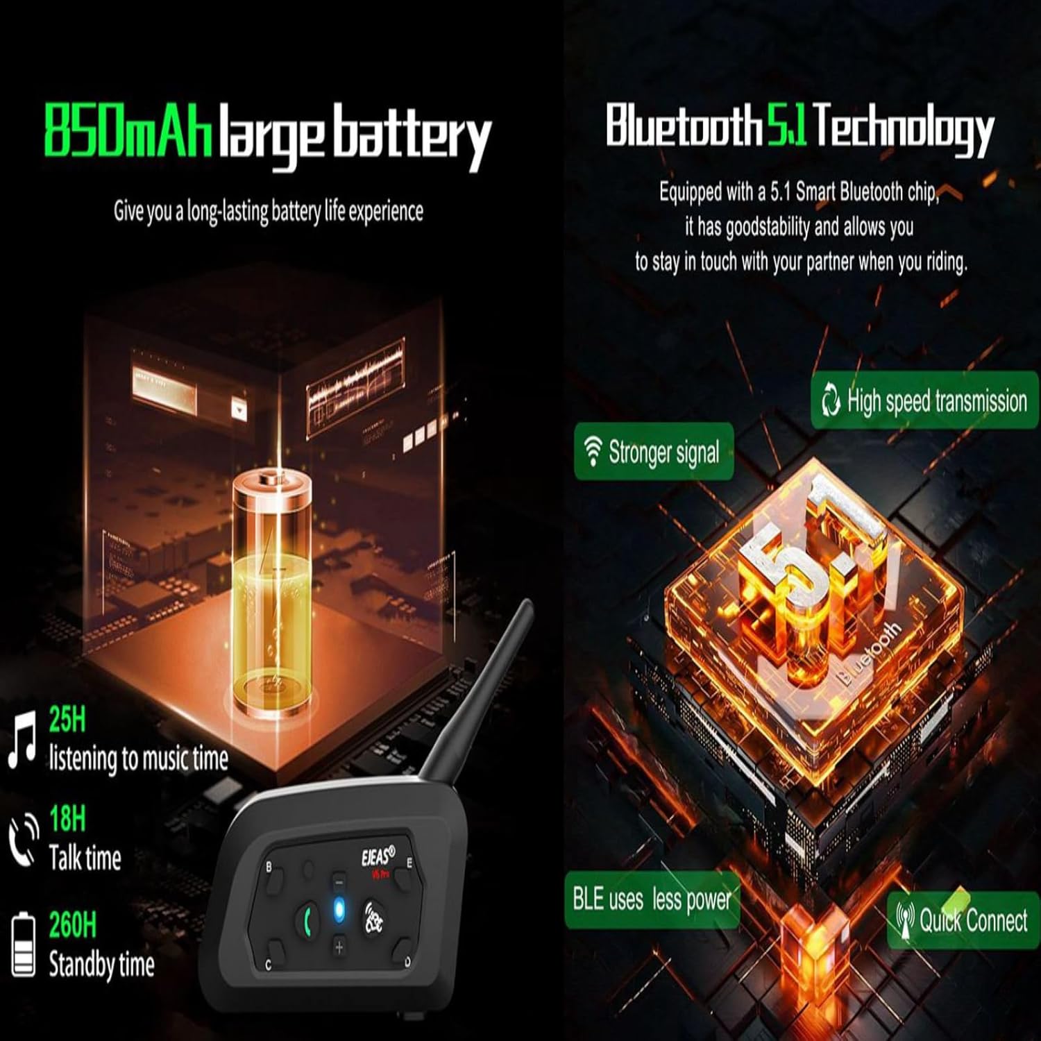 • 【Large Battery Capacity of Bluetooth Motorcycle Helmet】 The EJEAS V6 Pro intercom runs on 850mAh large rechargeable battery, just charge for 3.5 hours, the intercom working time can reach 12hours and the standby time can reach 360hours
