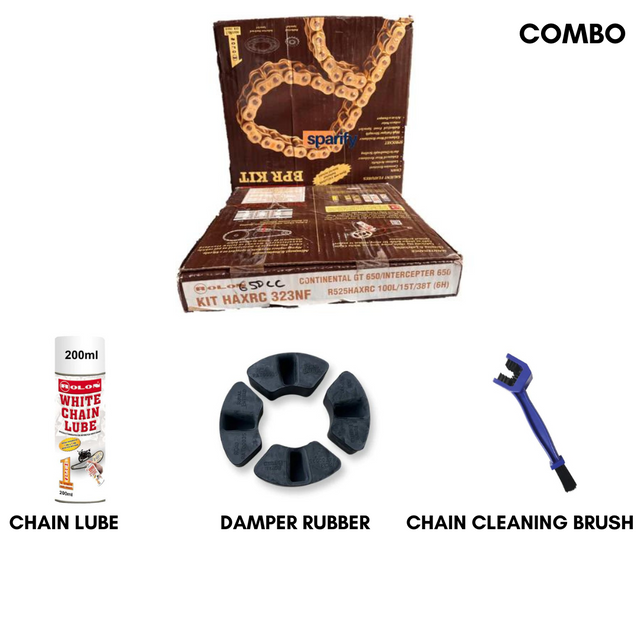 CONTAINS - BRASS CHAIN SPROCKET , DAMPER RUBBER , CHAIN LUBE 200ML & CHAIN CLEANER
