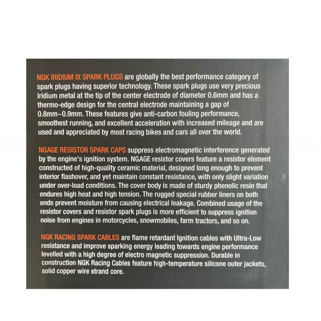 NGK IRIDIUM IX SPARK PLUGS are globally the best performance category of spark plugs having superior technology. These spark plugs use very precious Iridium metal at the tip of the center electrode of diameter 0.6mm and has a thermo-edge design for the central electrode maintaining a gap of 0.8mm. These features give anti-carbon fouling performance, smoothest running, and excellent acceleration with increased mileage and are used and appreciated by most racing bikes and cars all over the world.