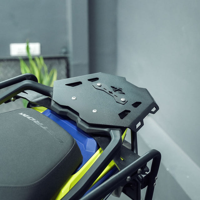 The Legundary Suzuki V Strom 800DE Haulier Rear Carrier Black for Suzuki V-Strom 800DE available at Bandidos pitstop is a robust and practical accessory designed to enhance your motorcycle's touring capabilities. Constructed from durable mild steel and finished with a black powder coating, it offers both strength and resistance to corrosion. This rear carrier provides a stable platform for mounting top boxes or additional luggage, ensuring your gear is securely fastened during rides. Its design focuses on weight-bearing and load balancing, ensuring that the added luggage does not compromise the Suzuki V Strom 800DE stability or performance. The product comes with all necessary mounting hardware, facilitating a straightforward installation process. Whether you're embarking on a cross-country adventure or a weekend getaway, this rear carrier provides the reliability and durability needed to carry your gear with confidence.