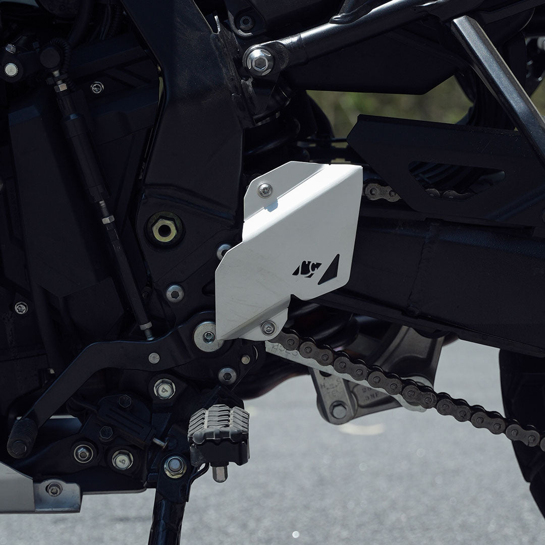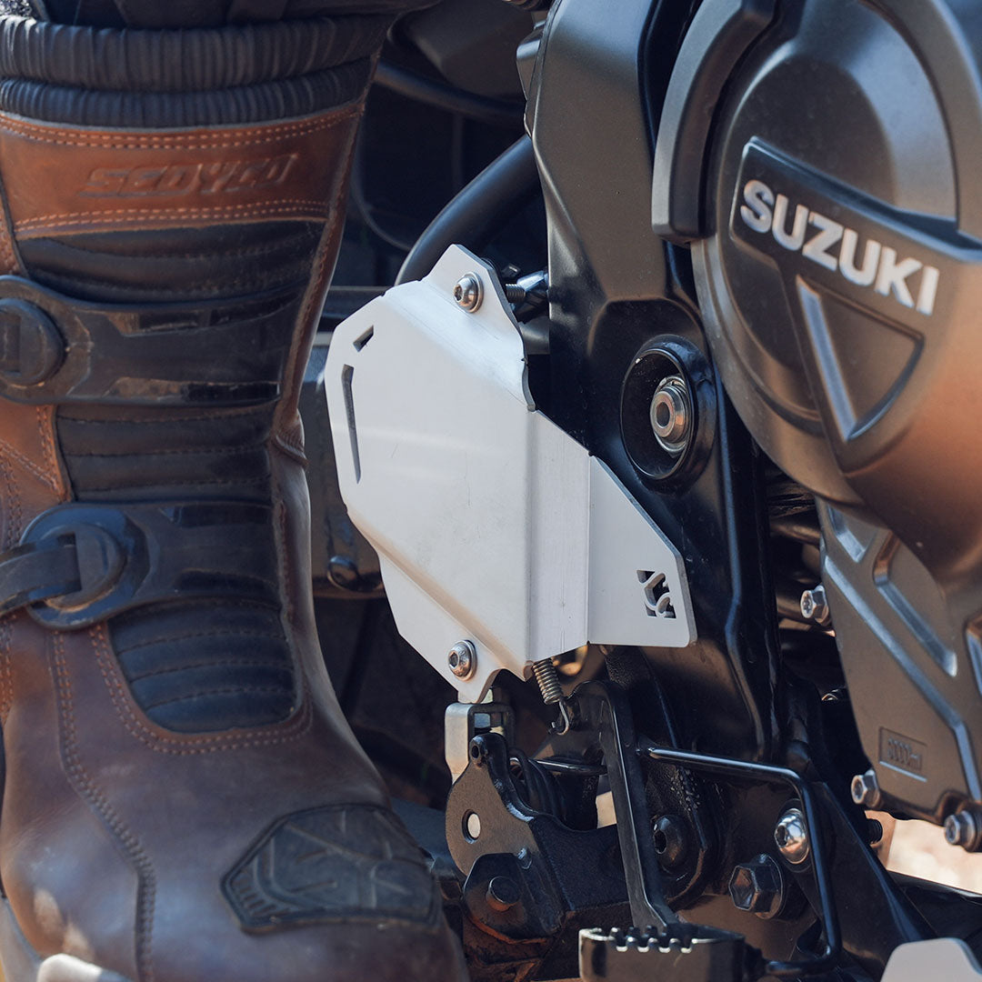 The Legundary Suzuki V Strom 800DE Titan Boot Guards Silver available at Bandidos pitstop are designed to provide robust protection for the Vstrom 800DE rear brake pump and rider's boots. Crafted from high-quality aluminium, these boot guards offer durability and resistance against corrosion, ensuring longevity even in harsh riding conditions. The silver finish adds a sleek, polished look that complements the V-Strom 800 DE aesthetic. These guards are engineered for a precise fit, allowing for straightforward installation without the need for modifications. By shielding critical components from potential damage during off road adventures or daily commutes, these boot guards enhance the safety and reliability of your ride.
