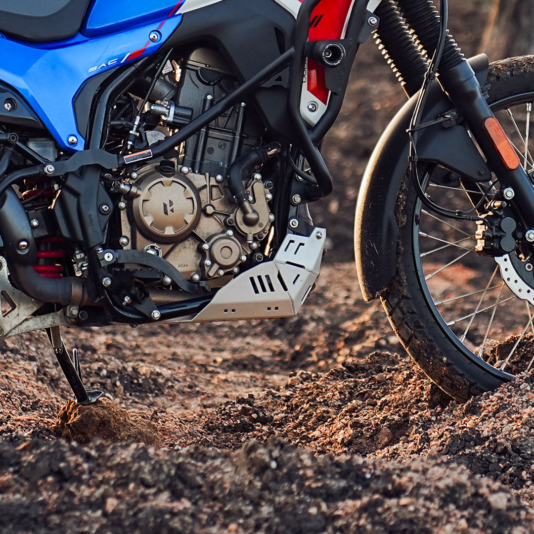The Legundary Hero Xpulse 210 Vambrace Bash Plate Silver available at Bandidos pitstop is engineered to provide robust protection for your X pulse 210 engine and undercarriage during off-road adventures and challenging terrains. Crafted from high-quality aluminum this bash plate offers a lightweight yet durable shield against rocks, debris, and other potential hazards encountered on the trail. Its corrosion-resistant silver finish not only enhances the aesthetic appeal of your bike but also ensures long-lasting performance. Designed specifically for the Hero Xpulse210 the bash plate features precision-cut mounting points for a secure and straightforward installation process. Whether you're navigating rugged trails or urban roads, this bash plate is an essential accessory to safeguard your Xpulse 210 vital components.