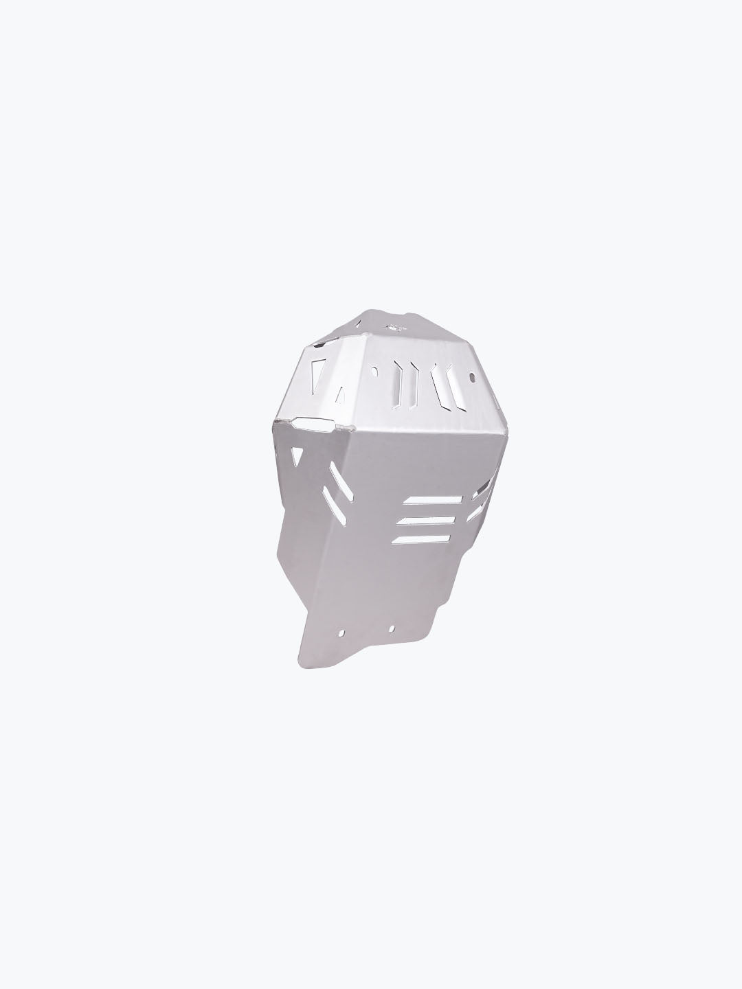 The KTM 390 Enduro R Vambrace Bash Plate Silver available at Bandidos pitstop is a heavy-duty yet lightweight engine protection solution crafted for serious adventure riding. the plate shields vital components like the oil filter and engine underside from rocks, debris, and trail hazards. Its floating mounting mechanism, supported by robust side brackets, keeps the plate isolated from direct engine contact to absorb impacts effectively and reduce stress on engine mounts. Vented cutouts at the front and sides promote airflow, support engine cooling, and allow quick drainage when traversing water obstacles. The kit includes all stainless-steel hardware and an installation guide for a seamless, bolt-on fit no modifications needed and finished with a rugged silver aesthetic that complements the Enduro R look perfectly.
