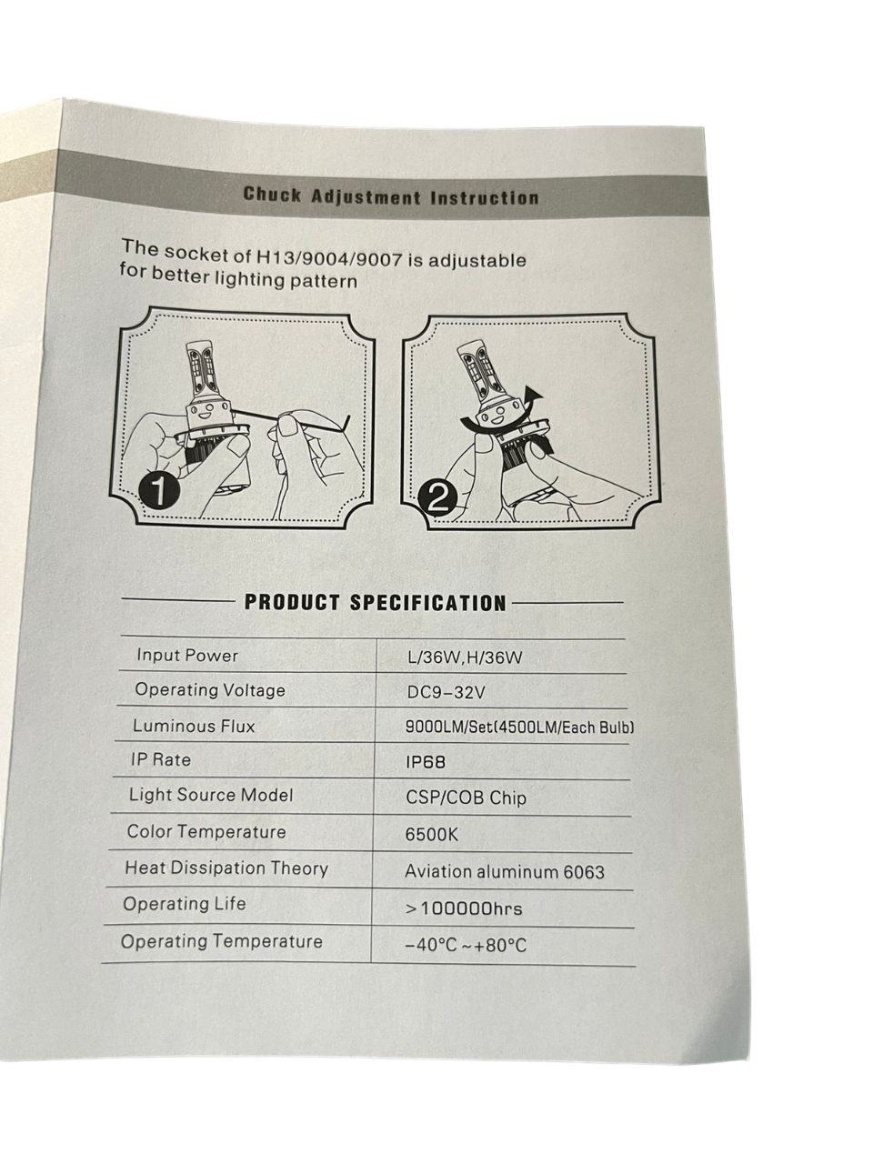 - High power and super lighting H4 automotive led headlight bulb 9000lm (4,500lms per bulb) 72w(36w each bulb) 6500k cool white light for imported csp led chips
